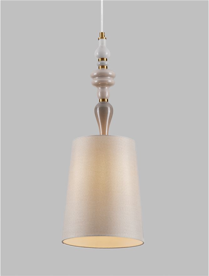 Nova Luce visilica DAMO 9009147 – Visoka dekorativna visilica sa E27 grlom. Kombinuje metal, keramiku i tkaninu u antik mesinganim i narandžastim tonovima.