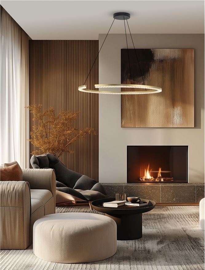 Nova Luce visilica GLEAMY 9030958 – Luksuzna visilica od 85 cm u pesak zlatnoj boji. Aluminijum i akril, 43W LED izvor sa 2795 lm toplog svetla i funkcijom dimovanja za perfektan ambijent.