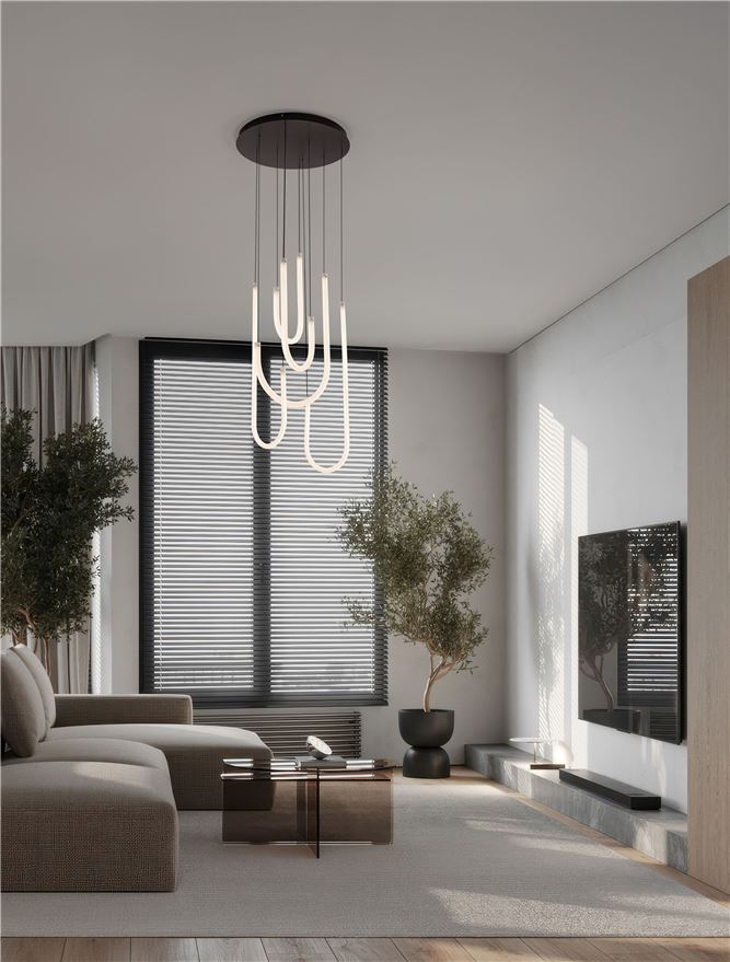 Nova Luce visilica TOPAZ 9100150 – moderna LED visilica mat crne boje sa 55W, 3850 lm i toplim svetlom od 3000K koju možete kontrolisati TRIAC dimovanjem.