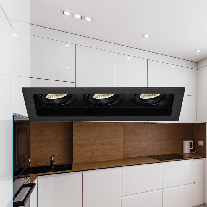 Ugradna rozetna BETA 3D kvadrat crna sa tri GU10 grla. Pogodna za galerije, lokale i trpezarije.