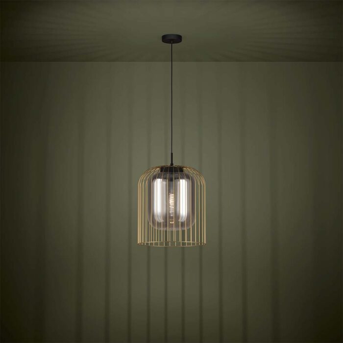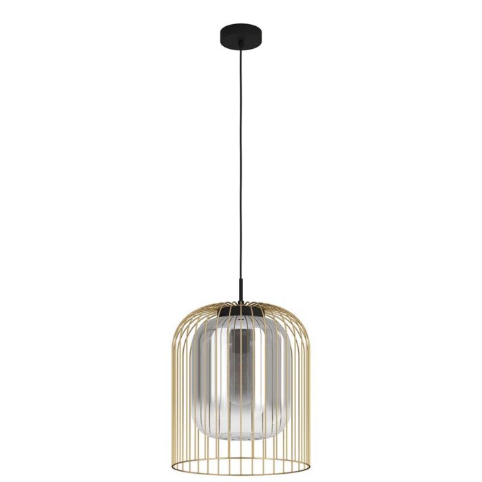 EGLO CAMINATA – luksuzna visilica sa zlatno-crnim čeličnim kućištem i prozirnim staklenim abažurom. E27 grlo do 40W, idealna za elegantne enterijere.